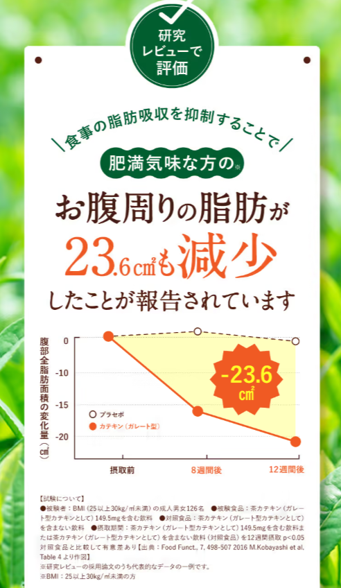 カテキンというとお茶が有名ですが、お茶と言えばの株式会社伊藤園さんが脂肪吸収抑制のメカニズムを科学的に証明したというニュースになったぐらいの成分。