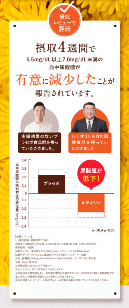 菊の花&カテキンの恵みに配合されているルテオリンはこの臨床試験で尿酸値の下げる効果が認められています。
